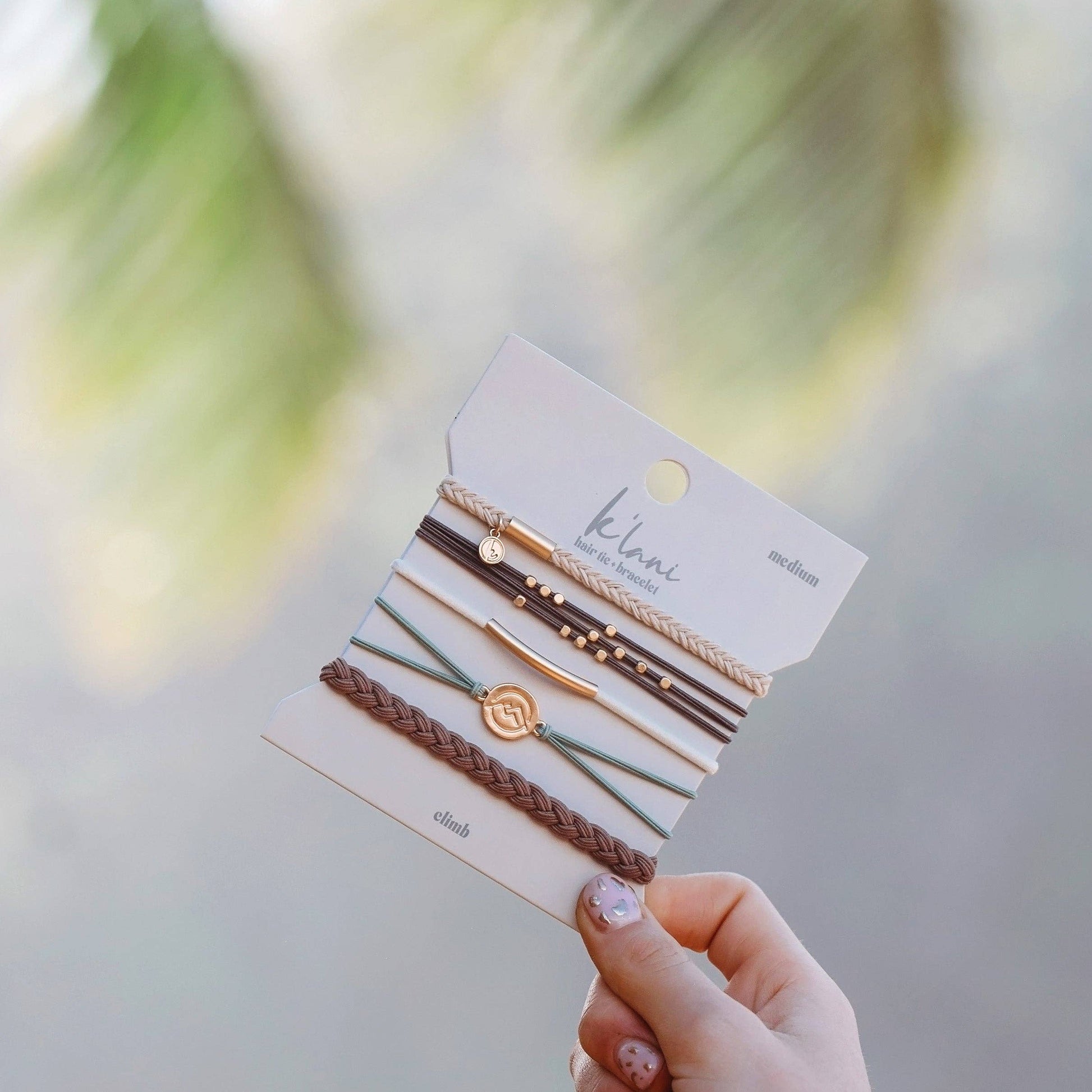 Our CLIMB set includes five bracelets that double as hair ties in gorgeous warm neutrals of brown, creams, and greens. This set with mountain peaks on the gold charm will remind us that our mountain top is in reach.